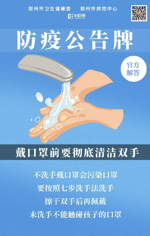 郑州市卫生健康委防疫公告牌:戴口罩前要彻底清洁双手 郑州卫生健康一点通 今天