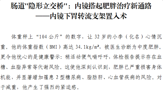 体重管理年健康科普专栏系列文章十八:肠道"隐形立交桥":内镜搭起肥胖治疗新通路 ——内镜下胃转流支架置入术