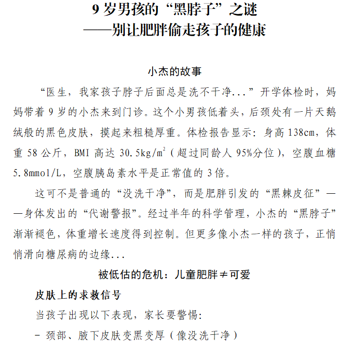 体重管理年健康科普专栏系列文章二十三:9岁男孩的“黑脖子”之谜:别让肥胖偷走孩子的健康