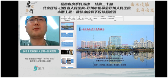 2021年1月6日,郑州市医学会血管外科专业委员会系列学术活动——京晋豫联合第20期网络查房如期举行。医学会血管外科专业委员会积极开展系列活动,在今年新冠肺炎疫情突发的情况下,举办了血管外科专业委员会颈动脉狭窄及复杂创面规范诊治网络直播学术论坛、京晋豫联合网络查房及静脉曲张微创治疗义诊讲座等活动,会议采取网络直播加互动模式,由来自国际、国内血管外科界知名专家,于美国华盛顿、北京、山西、上海、郑州、浙江、广州、重庆等地在线学术交流。本次活动由张玮院士作为名誉主席;北京医院李拥军教授、郑州人民医院李红普教授、山西省人民医院管强教授作为主席;达州市中心医院吴华平教授、山西省医科大学第一医院王贵阳教授、河南中医药大学第一附属医院周涛教授担任联合主席。此次线上查房还有幸邀请到安徽医科大学第一附属医院张君教授、北京积水潭医院刘建龙教授、山西白求恩医院张文沛教授作为特邀嘉宾,本期围绕“静脉血栓和下腔静脉滤器”展开讨论,全国各地血管外科医生再次线上相聚,共同学习,共同进步。