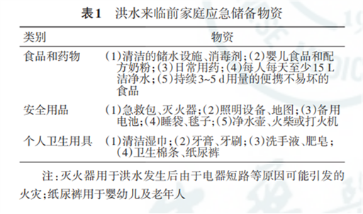 3.给房屋和车辆准备好应急供给物资,具体内容见表1,并把应急物资集中放置在便于拿取的位置。条件允许时,扎制木排、竹排,搜集木盆、木材、大件泡沫塑料等适合漂浮的材料,加工成救生装置以备急需。