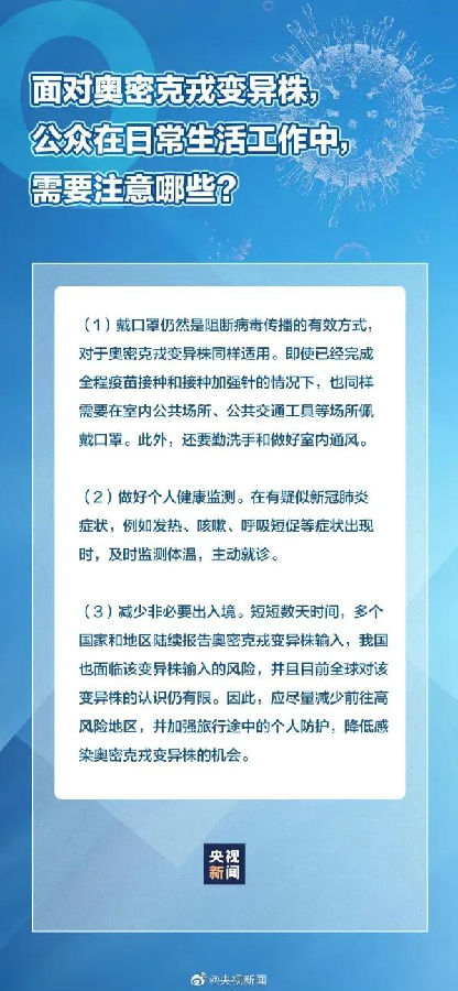 针对新冠病毒奥密克戎变异株,国家卫生健康委组织中国疾控中心专家就有关问题进行了解答,其中提到,面对新出现的新冠病毒奥密克戎变异株,公众在日常生活工作中,需要注意哪些?