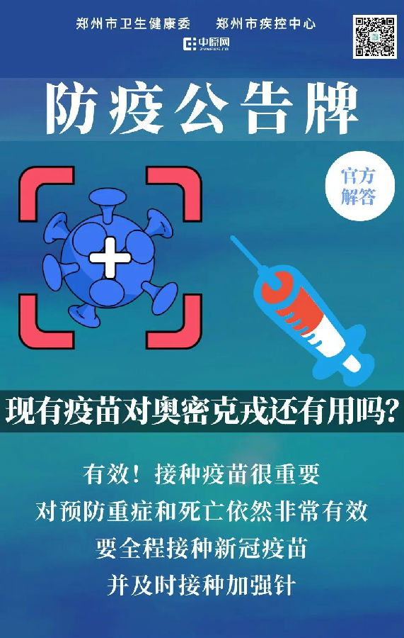 郑州市卫生健康委防疫公告牌:现有疫苗对奥密克戎还有用吗?