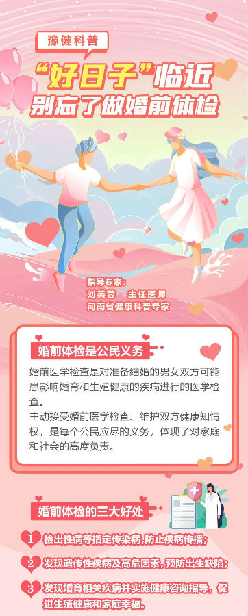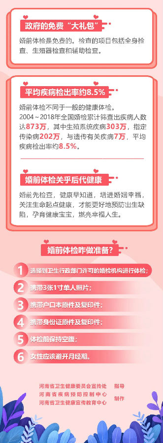 温馨提醒:婚检时双方需到卫生行政部门许可的婚检机构进行,携带三张一寸单人照片、户口本身份证原件复印件、空腹,女性避开月经期。《河南省人口与计生条例》第二十七条:参加婚前医学检查的,再增加婚假七日哦!