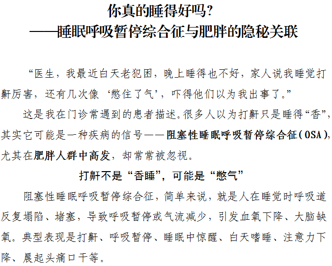 体重管理年健康科普专栏系列文章五:你真的睡得好吗? ——睡眠呼吸暂停综合征与肥胖的隐秘关联