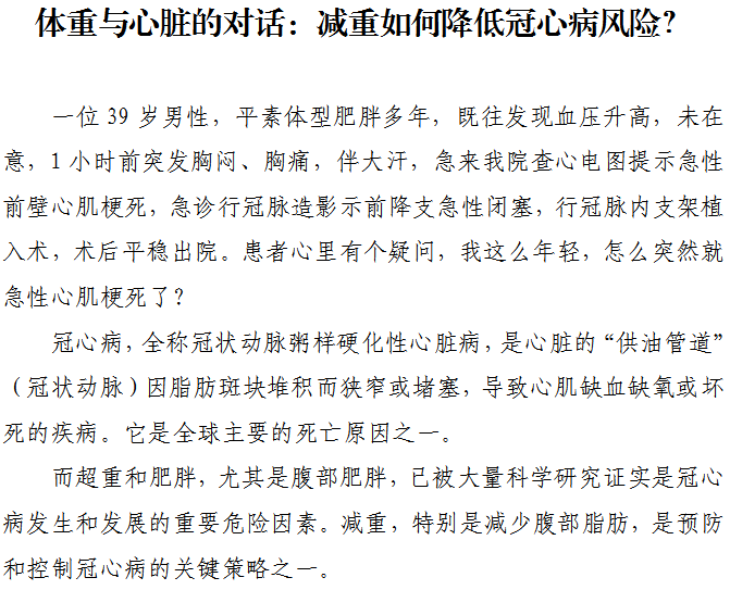 体重管理年健康科普专栏系列文章九:体重与心脏的对话:减重如何降低冠心病风险?